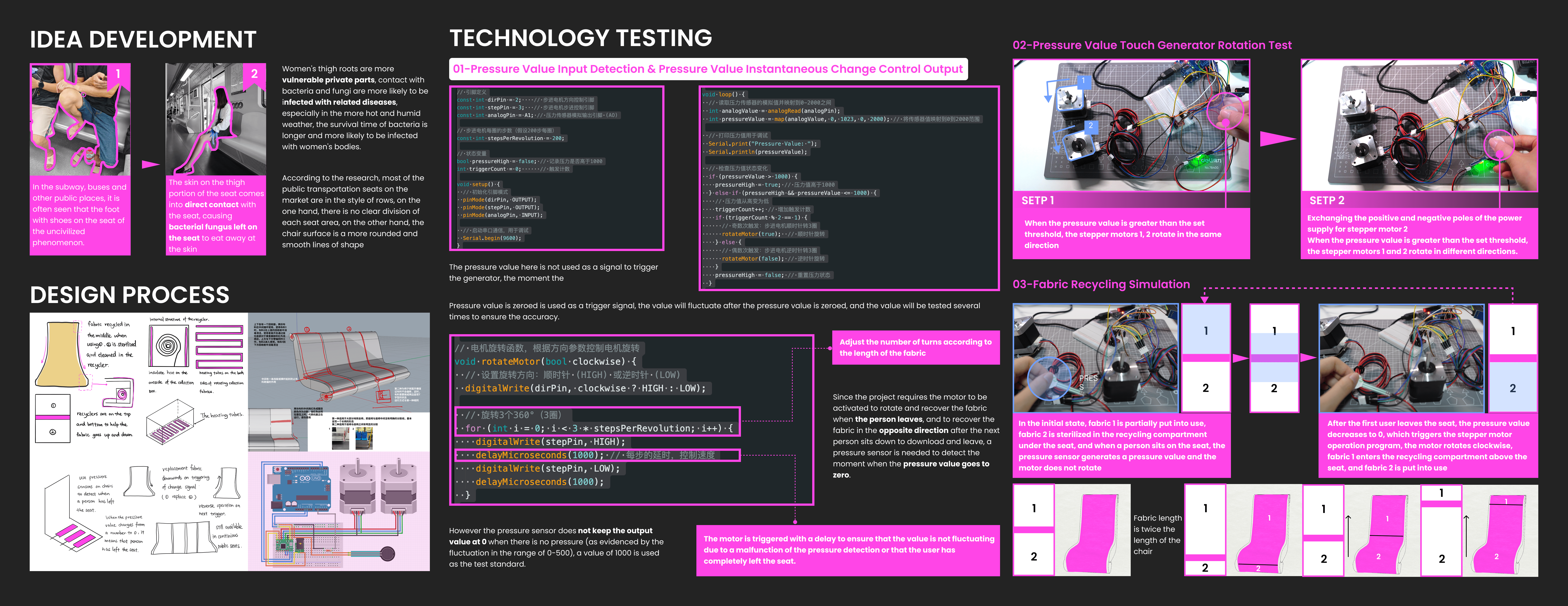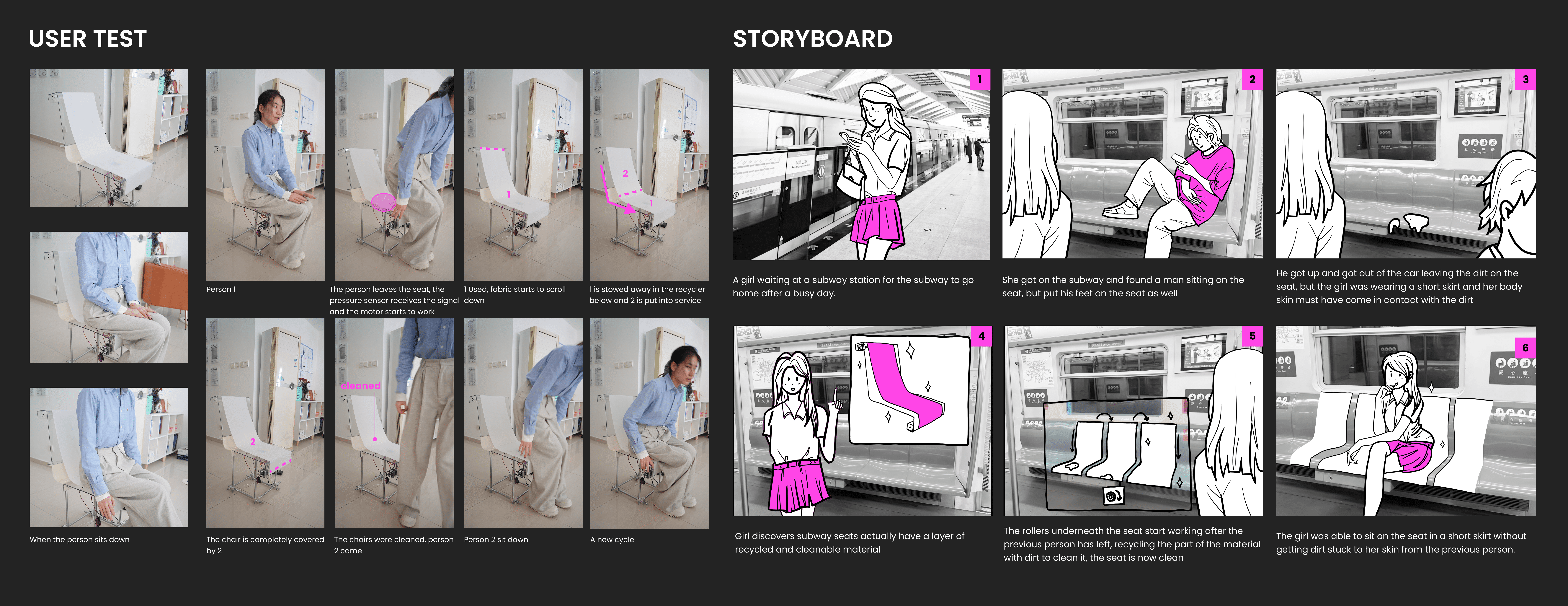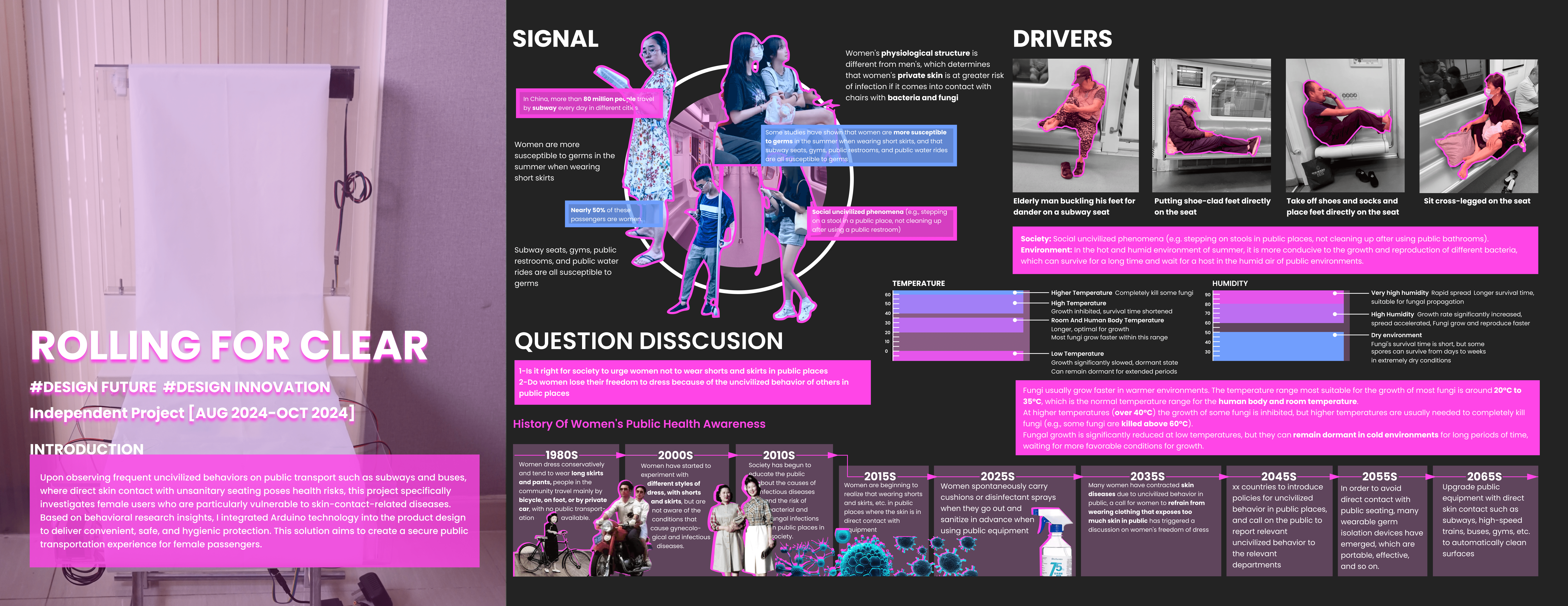 Upon observing frequent uncivilized behaviors on public transport such as subways and buses, where direct skin contact with unsanitary seating poses health risks, this project specifically investigates female users who are particularly vulnerable to skin-contact-related diseases. Based on behavioral research insights, I integrated Arduino technology into the product design to deliver convenient, safe, and hygienic protection. This solution aims to create a secure public transportation experience for female passengers.